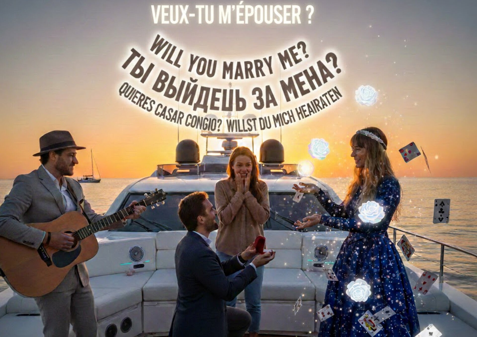 For this unique and powerful approach, we offer a range of specialized services tailored to your needs. Imagine... you ask your future partner to go for a boat ride. While they are completely unaware of what is about to happen, the skipper sings a song that you have chosen in advance, a magician performs a few tricks, and at the most unexpected moment, you offer a ring to the love of your life. The champagne flows freely and the moment is forever etched in your memory. Of course, thanks to an on-board camera, we film and photograph the scene.